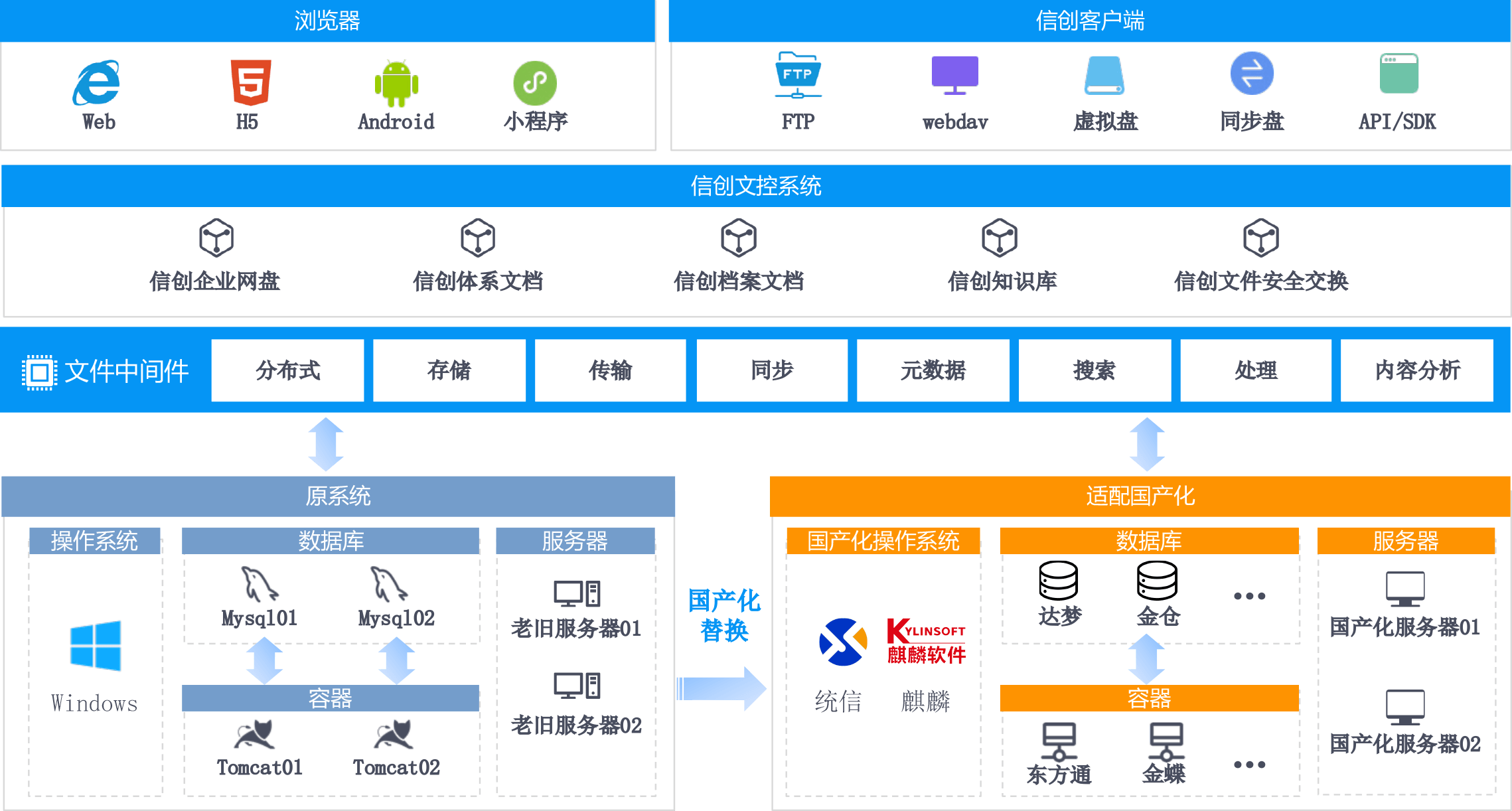 基于信创文件中间件,立足自主可控,从底层芯片,服务器,操作系统,为各行各业提供信创中间件打造的文件全场景应用,实现全面国产化兼容适配。