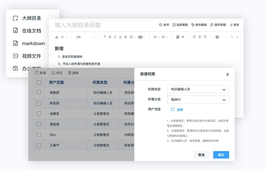 知识管理员针对企业知识模型进行构建,知识从创作、发布审核进行权限指派,结合知识运营数据有效盘活企业知识,确保合理保存、传播利用(新建页面、目录结构、审核页面)