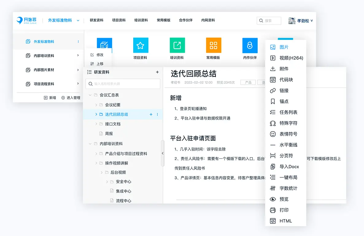 简单易用 简单易用、所见即所得,在线文档编辑器,配备丰富的插件,可轻松创建企业知识内容分享传播。 |