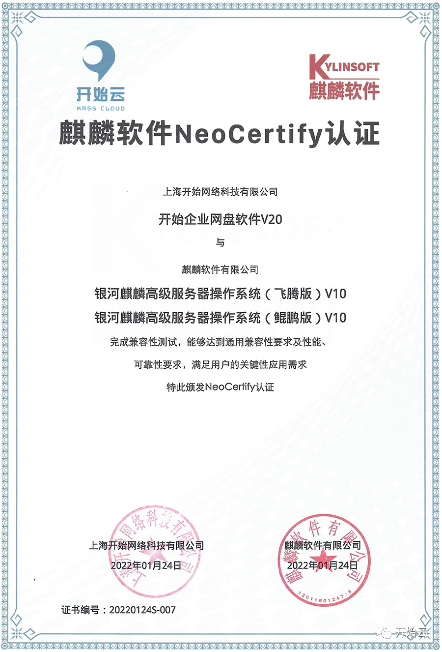 助力国产化,开始云企业网盘通过麒麟软件neocertify认证