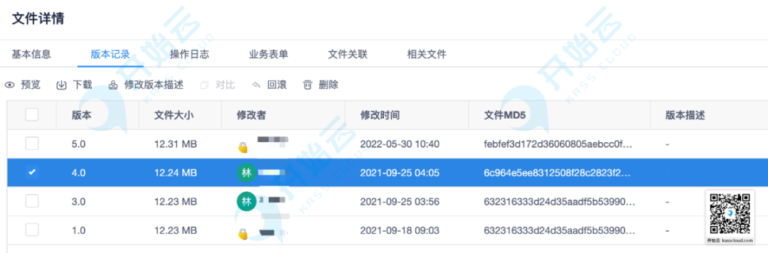 ●允许误修改文件后,将文件回滚至指定历史版本,用历史版本替换当前最新版本,即时生成新版本文件。