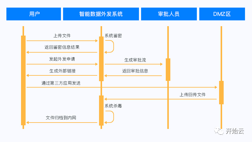 敏感数据内网导出到外网——内网数据经系统鉴密且通过流程审批后,文件发送到外网,内部用户可外网登陆使用。