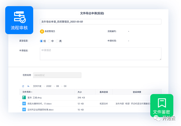 业务系统与本系统对接,所有外发文件需经本系统鉴密且通过流程审批后可外发至客户