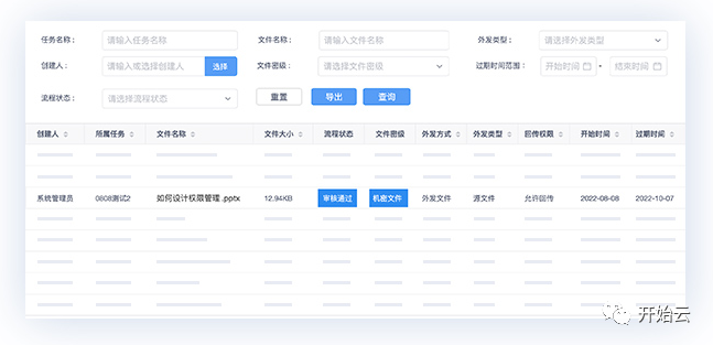 支持可按任务名称、文件名称、外发类型、创建人、文件密级、过期时间范围、流程状态审计查询系统中外发文件的状态。