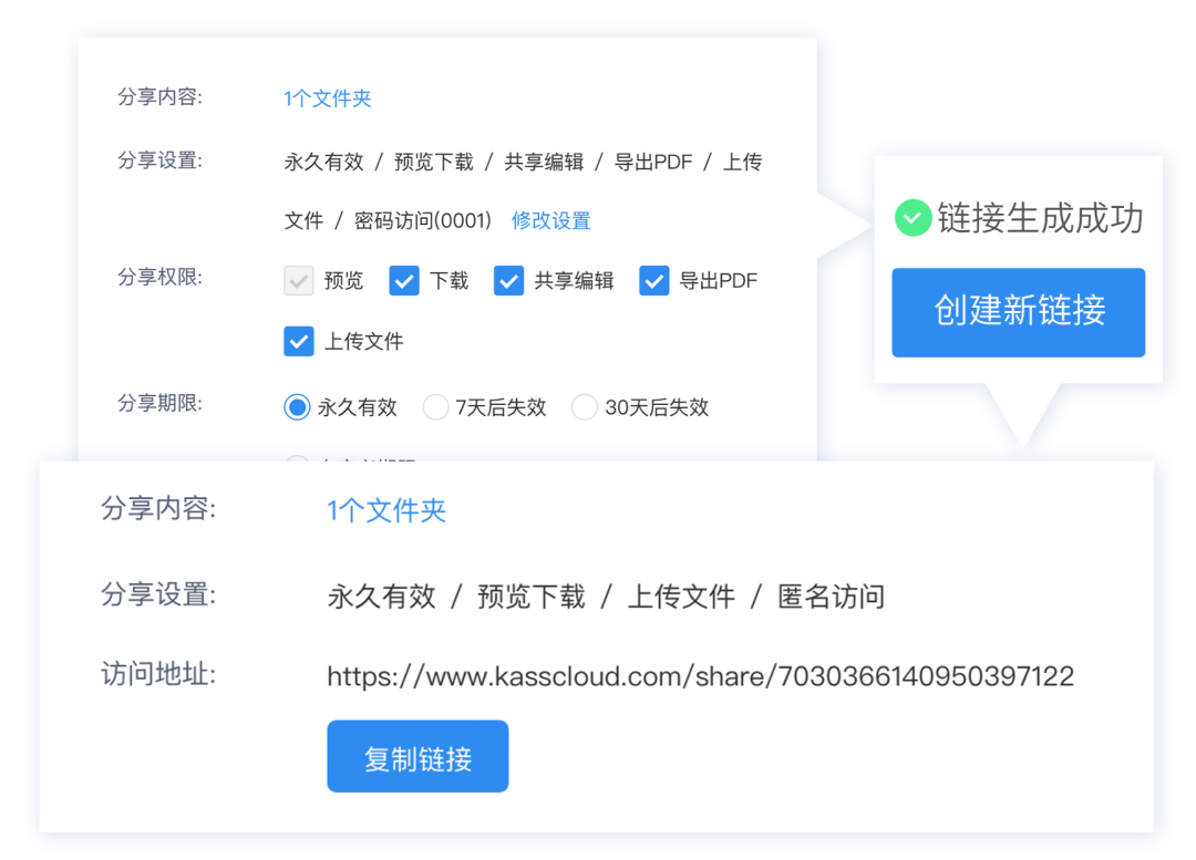 基于文件使用,可以一站式对文件进行更新、修改、分享、评论、批注等协同操作。同时,支持即时消息发送,通过设置消息提示、动态更新,用户可以及时掌握了解文档的最新动态。同时支持一键生成外链,通过外链分享快速与客户对接,实现文件准确传递。高效地沟通协作,大大完善了工作流程,提升了协同办公效率。