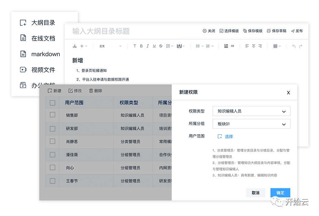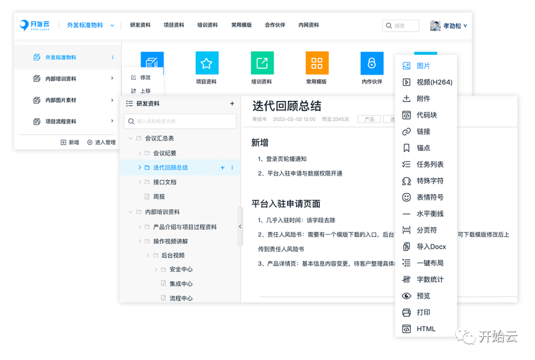 知识库可以帮助建筑行业解决因公司结构、部门庞大复杂,人员组成多样,造成的图纸从设计、现场施工,到工程验收整个过程中文件传输的安全性与准确性问题。也可大幅度降低文档管理成本,使不同地域不同部门不同项目的文件高效流转,方便企业员工之间的沟通和协作办公,提升项目管理水平,有效提高办公效率,开始云也始终以客户实际业务需求为导向,保护企业知识财富传承,在协助企业实现文件管理电子化的道路上砥砺前行!