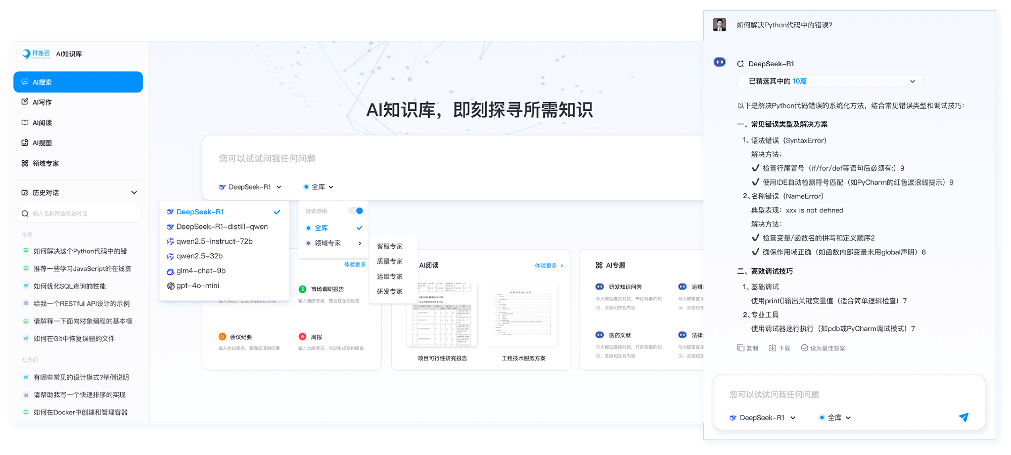 针对特定知识库范围,可自定义领域专家,设定大模型角色 ,个性化提示语工程。例如:基于客服知识库的客服专家、基于质量知识库的质量专家等。