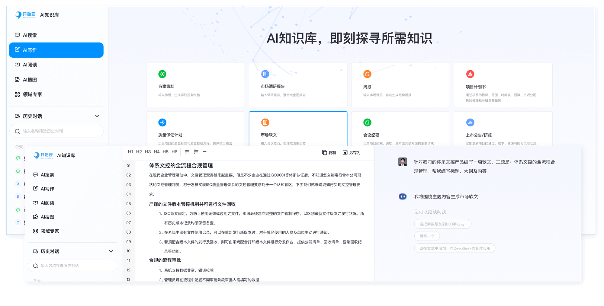 精准捕捉用户写作需求,私域知识库融合大模型来辅助生成内容,从产品文档到战略报告,从一键成文到人机协同, 提升写作效率和文章质量。例如:产品介绍、项目计划、策划方案、总结报告等等。