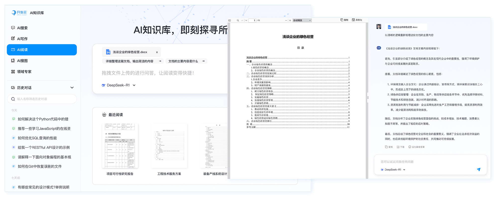 基于大模型,对私域知识库中的文档进行深度解读,辅助用户快速理解文件内容。帮助用户快速梳理出文档的主旨大意、章节结构,精准定位并提取出关键数据、重要论点等,极大提升阅读效率。
