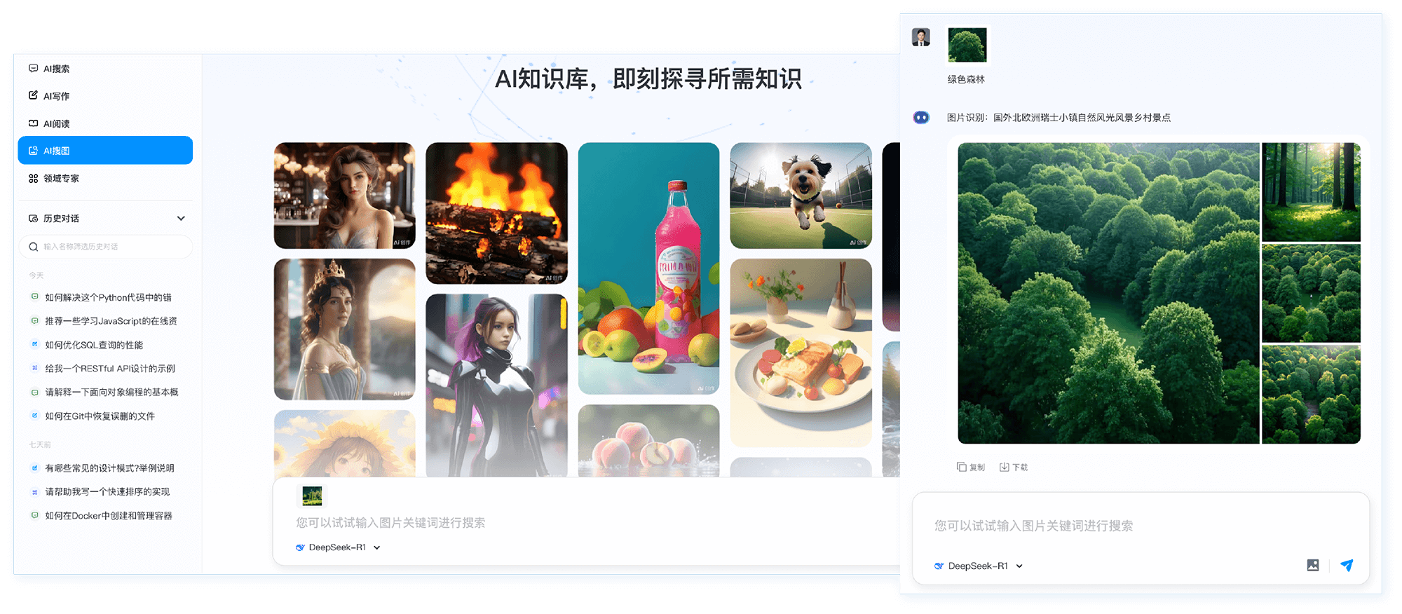 利用图像识别技术,对私域知识库中的图片展开智能分析,进而实现以文搜图和以图搜图功能。帮助用户在海量图库中快速搜索出需要的图片。