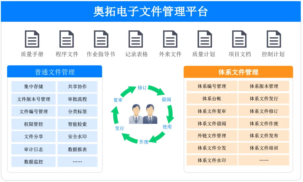 解决了质量部体系文件之前管理不统一,导致文件遗失的问题,同时也提高了(总裁办、董办、证券事务部、采购管理中心、计财部)和LED显示事业群(深奥综合管理部、质量部、惠奥采购部、惠奧质量部) 电子文档管理需求,以文档管理为依托实现奥拓文档管理电子化、平台化、集成化、移动化并且系统具备较强的扩展性。