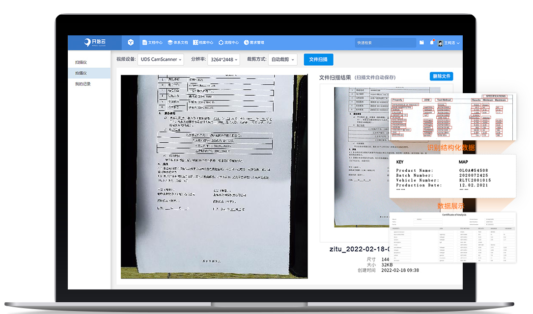借助紫图CF324PR高拍仪对接进行系统集成,用户可以将纸质文件进行拍照生成PDF文件,发送至FlexiCapture软件进行扫描,并显示结果完成泰比Abby对接,由Abbyy对数据进行处理,提取,最终形成可视化界面,对于识别中出现疑问的地方采用标红的方式提醒用户进行二次鉴定,最终将终版数据递交到数据库,供其他业务平台调用。