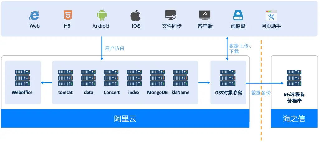 采用开始云网盘搭建海之信统一的用户端文档资料采集平台,统一文档数据中心 ,文档系统与原有系统进行用户、文件、流程集成;文件定稿、文件模板、文件修改、文件报表、回收站等功能定制开发,本地同步盘程序与OUTLOOK功能集成嵌套,阿里云对象存储与本地备份存储混合云部署。
