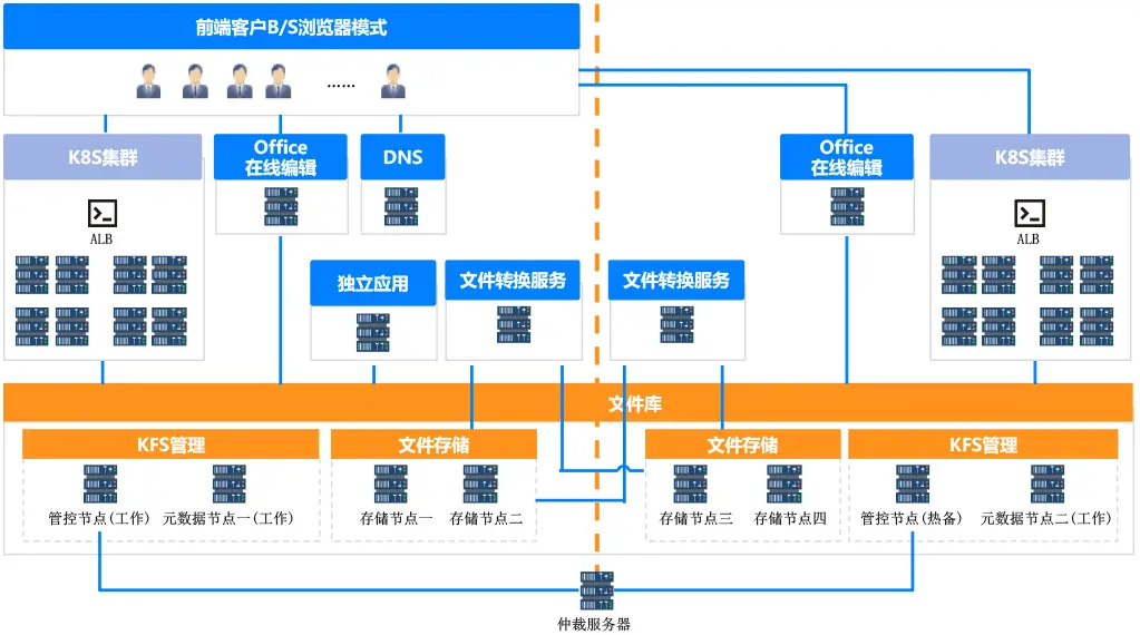 启用Kfs文件中间件应用,基于Kfs异地分布式存储架构,保证系统运行稳定,定时可用,单点故障不影响其他系统运行,实时部署跨地区之间文件文件同步,不同区域就近访问。